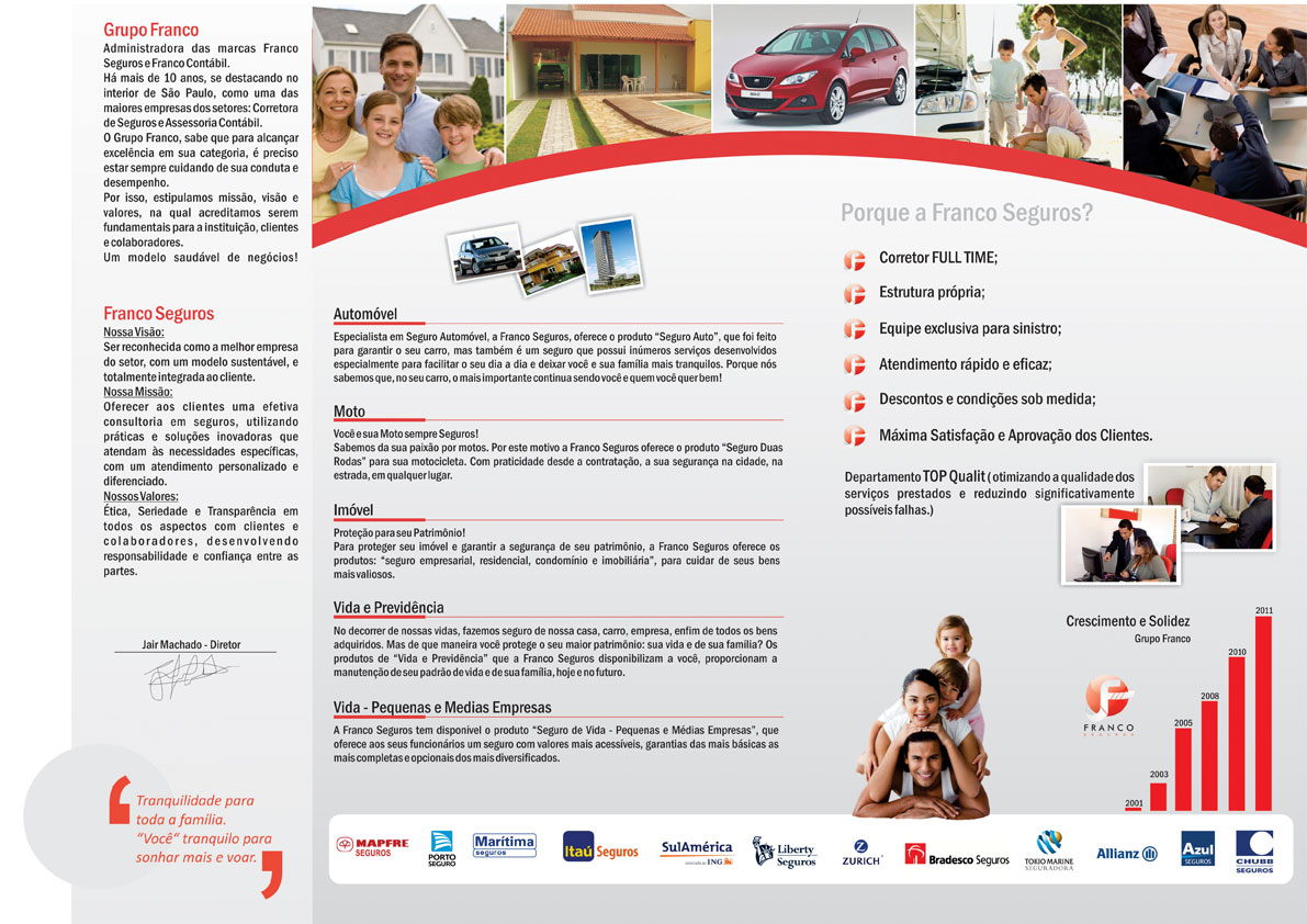 Há mais de 10 anos, se destacando no interior de São Paulo, como uma das maiores empresas do setor: Corretora de Seguros. A Franco Seguros, sabe que para alcançar excelência em sua categoria, é preciso estar sempre cuidando de sua conduta e desempenho. Por isso, estipulamos missão, visão e valores, na qual acreditamos serem fundamentais para a instituição, clientes e colaboradores. Um modelo saudável de negócios!